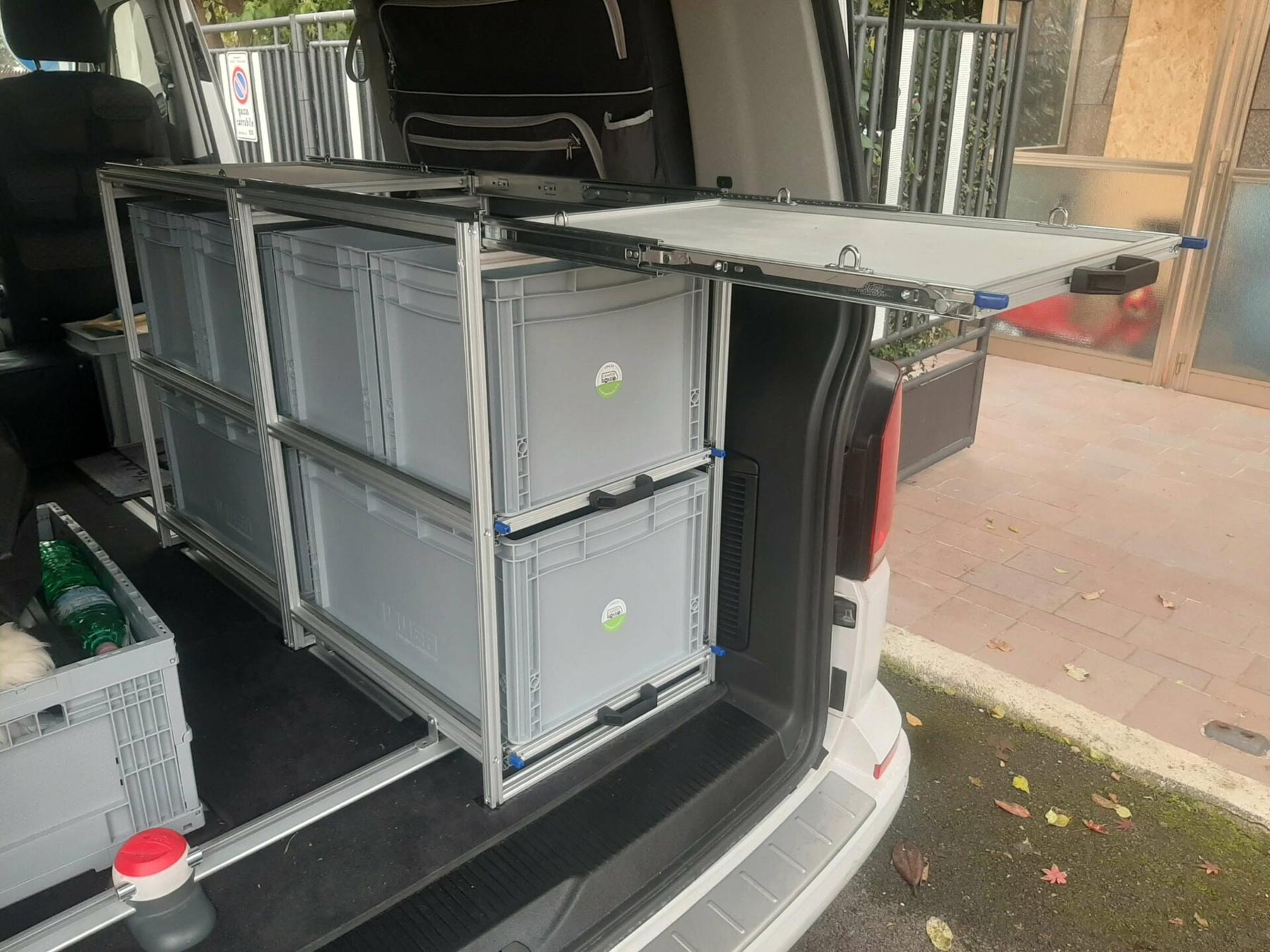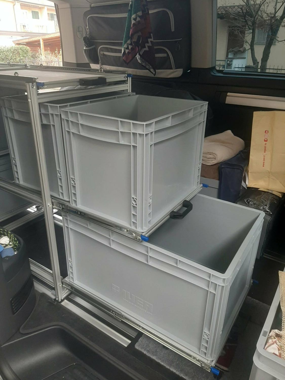 La struttura integra due ripiani estraibili con contenitori in plastica, entrambi con doppia apertura: puoi accedere agli oggetti dal bagagliaio quando sei fuori, oppure dall’abitacolo quando sei all’interno.