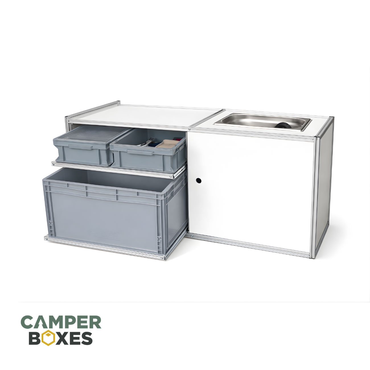 Dotata di lavello in acciaio inox, piano di appoggio per fornello e cassetti per utensili e provviste, organizza tutto il necessario per cucinare con comodità ovunque ti trovi.